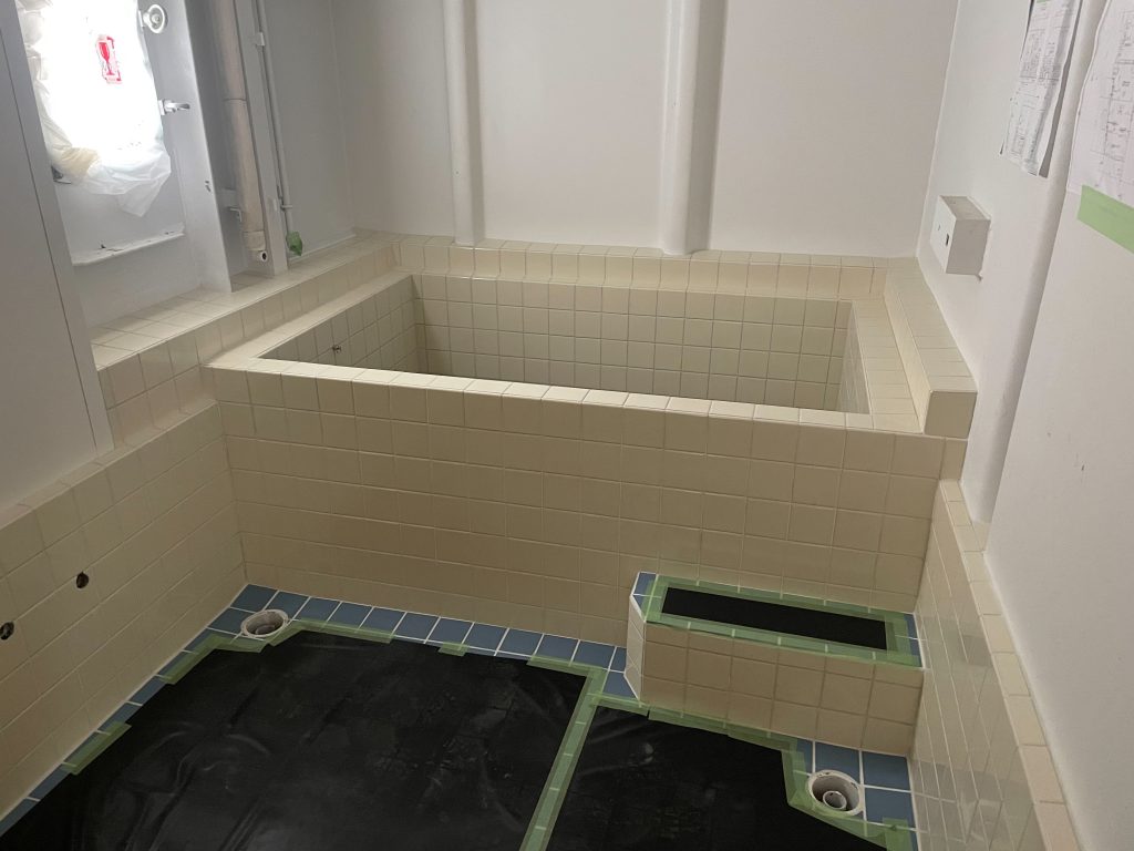 タイルが貼られ大浴場の工事も進んでおります。